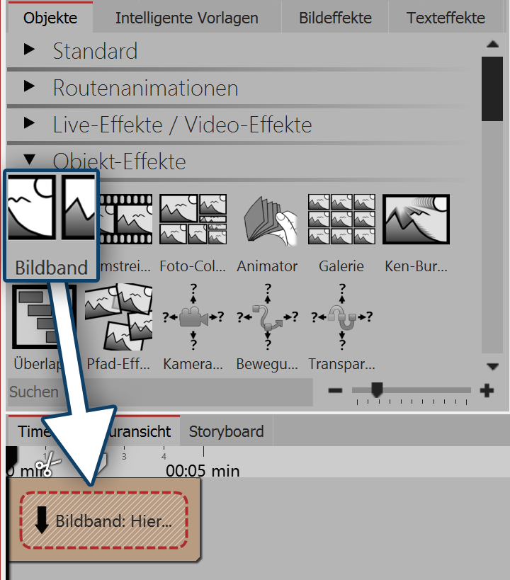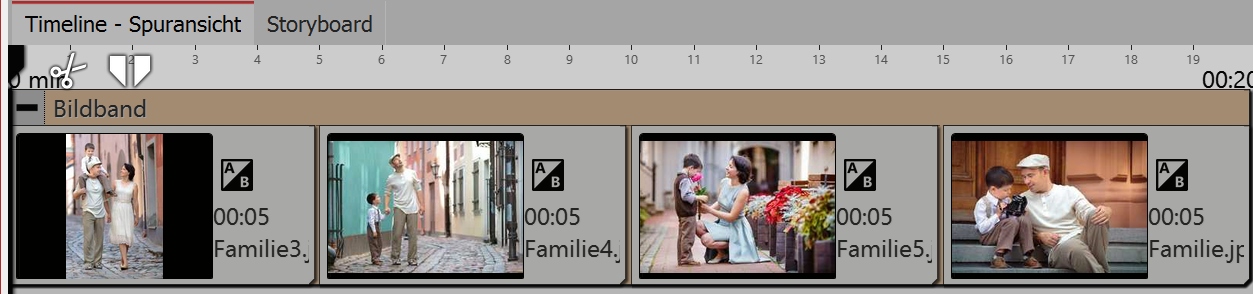 1. Bildband erstellen![]() Bildband einfügen Ziehen Sie den Bildband-Effekt aus der Toolbox in die Timeline. In der Timeline sehen Sie nun ein farbiges Kästchen. Hier fügen Sie Ihre Bilder ein. Holen Sie die Bilder dabei z.B. über den Toolbox-Reiter Dateien in die Timeline oder ziehen Sie ein Bild-Objekt in den Bildband-Effekt, um die Bilder einzufügen. Im Bildband können die Bilder nur hintereinander angeordnet werden. ![]() Gefüllter Bildband in der Timeline |