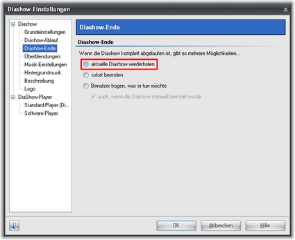 In der Menüleiste können Sie über das Symbol die Diashow-Einstellungen öffnen. Wahlweise können Sie auch über Diashow -> Diashow-Einstellungen den Dialog öffnen. Unter Diashow-Ende können Sie die Wiederholfunktion aktivieren.