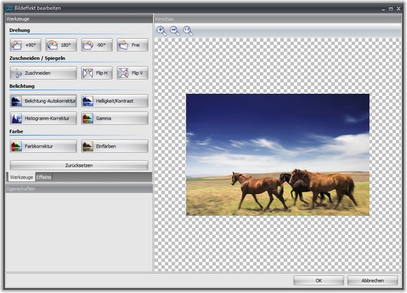 Unser Ziel ist es, Ihnen mit der AquaSoft ® DiaShow zugleich alle Werkzeuge in einem einzigen Programm zur Hand zu geben. Deshalb ist eine Bildbearbeitung integriert, mit der Sie Ihre Fotos für die Diashow verbessern können. Nun gibt es zwar spezialisierte Bildbearbeitungsprogramme, die vom Funktionsumfang über das Bildbearbeitungsmodul der AquaSoft ® DiaShow hinausgehen, doch es sollte möglich sein, die wichtigsten Aufgaben hier direkt im Programm lösen zu können.