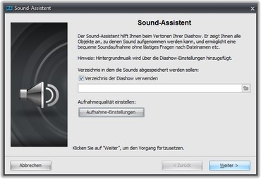 Mit Hilfe des Sound-Assistenten können Sie gesprochene Kommentare und Geräusche zu Ihren Bildern über ein am PC angeschlossenes Mikrofon aufnehmen. Den Sound-Assistenten finden Sie im Menü unter Assistenten.