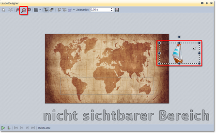 Das Schiff soll von rechts in das Bild gleiten. Dazu wird wieder der nicht-sichtbare Bereich genutzt. Um einen besseren Zugriff darauf zu erhalten, verkleinern Sie die Ansicht, indem Sie auf klicken.