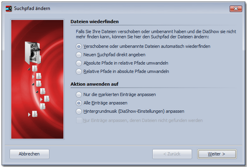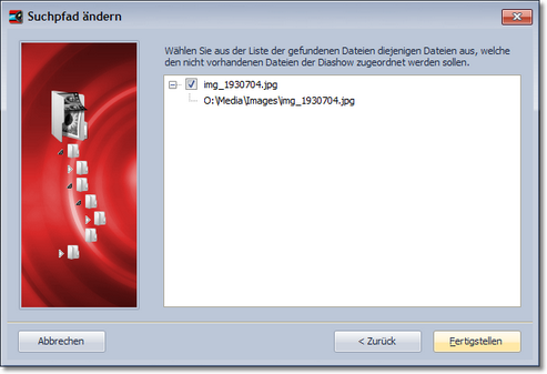 Gelöschte Bilder kann die AquaSoft ® DiaShow nicht wiederherstellen, jedoch kann Ihnen der Assistent dabei helfen, verschobene oder umbenannte Dateien wieder in die Show einzufügen.