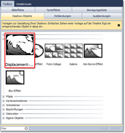 Sie finden den Displacement-Effekt unter den Diashow-Objekten in der Toolbox.