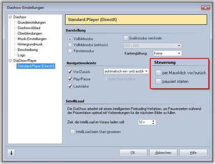 Möchten Sie während der Show selbst weiter schalten, so können Sie in den Diashow-Einstellungen den DiaShow-Player entsprechend konfigurieren.