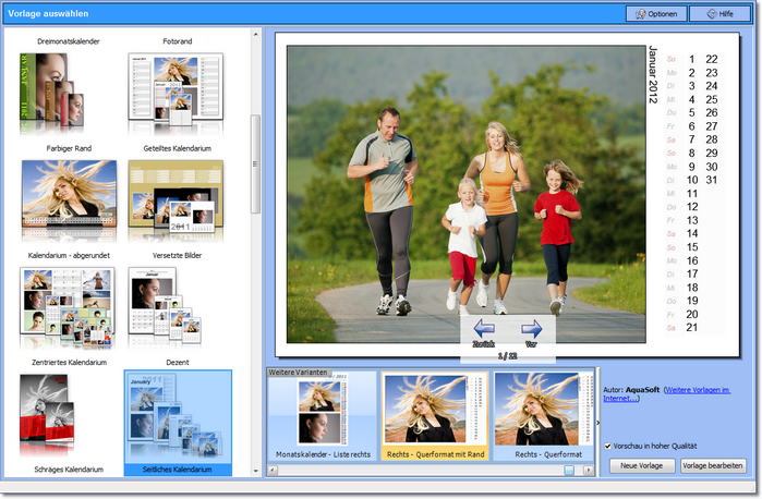 In diesem Schritt wählen Sie die Vorlage aus. Dieser sorgt für die Sortierung und den Stil der Anzeige der Bilder innerhalb des Fotokalenders. Auf der linken Seite sind die verschiedenen Vorlagen in Kategorien eingeteilt. Durch Klick auf eins der Vorschaubildchen wird eine größere Vorschau auf der rechten Seite angezeigt. In dieser Vorschau können Sie alle Seiten des Fotokalenders bereits durchblättern. Zusätzlich sind weitere Informationen über die gewählte Vorlage, wie Autor und Beschreibung zu sehen. Die Buttons am unteren Bildschirmrand benötigen Sie nur, wenn Sie Vorlagen selbst bearbeiten wollen.