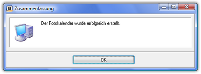 Im letzten Schritt wird Ihr Fotokalender erstellt. Je nach der Auswahl Ihres gewünschten Ausgabeformats, werden dabei noch einmal Informationen von Ihnen verlangt. Wenn Ihr Fotokalender erstellt wurde, werden Sie mit folgendem Dialog davon unterrichtet. Sollten Fehler bei der Erstellung aufgetreten sein, werden diese hier ebenfalls angezeigt.