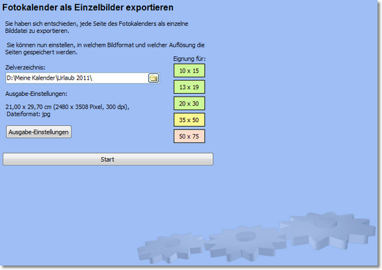 Beim Exportieren zu Einzelbildern wird jede Seite des Fotokalenders als Bild abgespeichert. Dazu müssen Sie das Zielverzeichnis der Bilder angeben. Weiterhin können Sie die Art und Qualität der zu erstellenden Bilder sehr genau unter den "Ausgabe-Einstellungen" konfigurieren.
