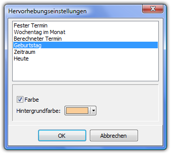 Die Hervorhebungseinstellungen legen fest, wie die Termine einer Terminliste im Kalender angezeigt werden. Sollte eine andere im Kalender verwendete Terminliste andere Einstellungen benutzen, werden jeweils die Einstellungen der zu dem jeweiligen Termin gehörenden Terminliste genutzt. Sie legen die Hervorhebungseinstellungen für eine Terminart fest. Im Kalender wird sich also jeder Termin dieser Art in der jeweiligen Liste nach den Einstellungen richten. Die möglichen Einstellungen sind: