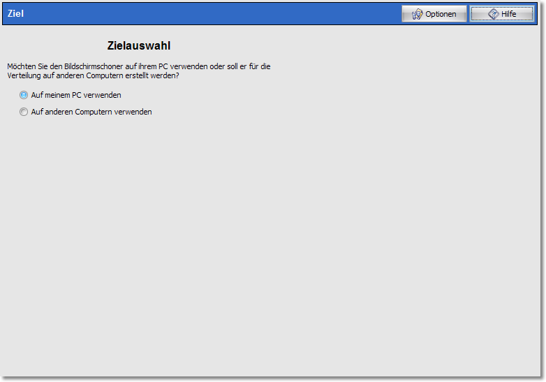 Mit der Wahl des Ziels legen Sie fest, ob der Bildschirmschoner auf Ihrem PC installiert oder als Weitergabe für andere PCs erstellt werden soll.