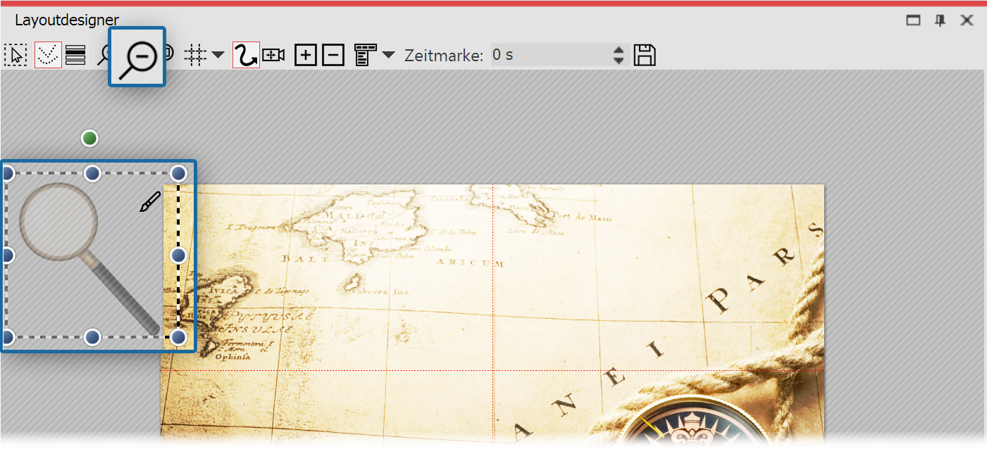 2. Bild verkleinern![]() Verkleinern der Grafik im Layoutdesigner Die Lupe ist noch etwas groß, verkleinern Sie sie etwas, um mehr Spielraum für die Bewegung zu haben. |