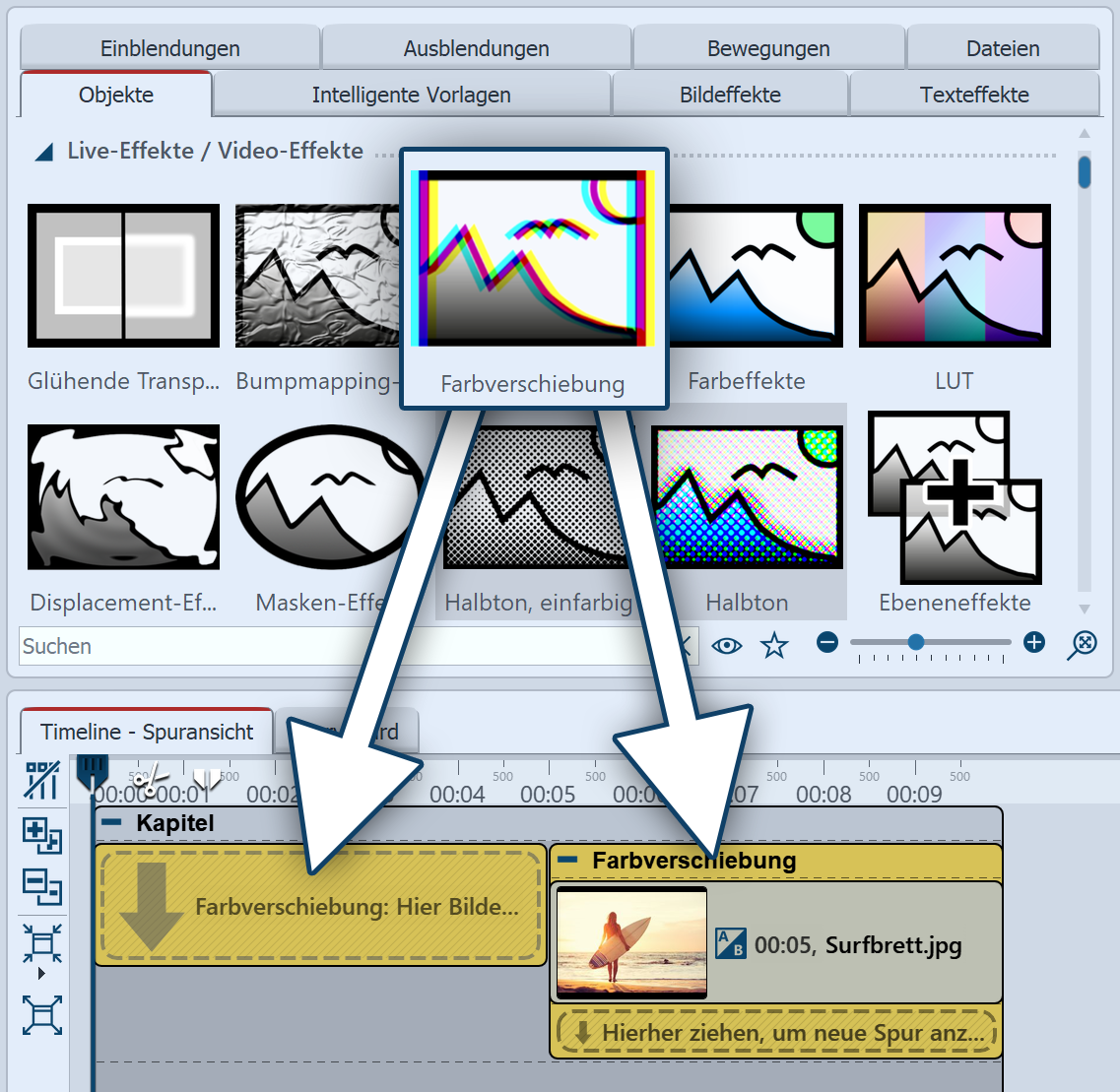 ![]() Farbverschiebung einfügen 1. Anwendung der FarbverschiebungUm den Effekt zu verwenden, können Sie ihn direkt auf ein Bild in der Timeline ziehen. Sie können den Effekt auch in die Timeline ziehen und später eines oder mehrere Bilder einfügen. Wenn Sie auf den farbigen Rahmen klicken, können Sie im Bereich Eigenschaften die Einstellungen für den Effekt festlegen. |
