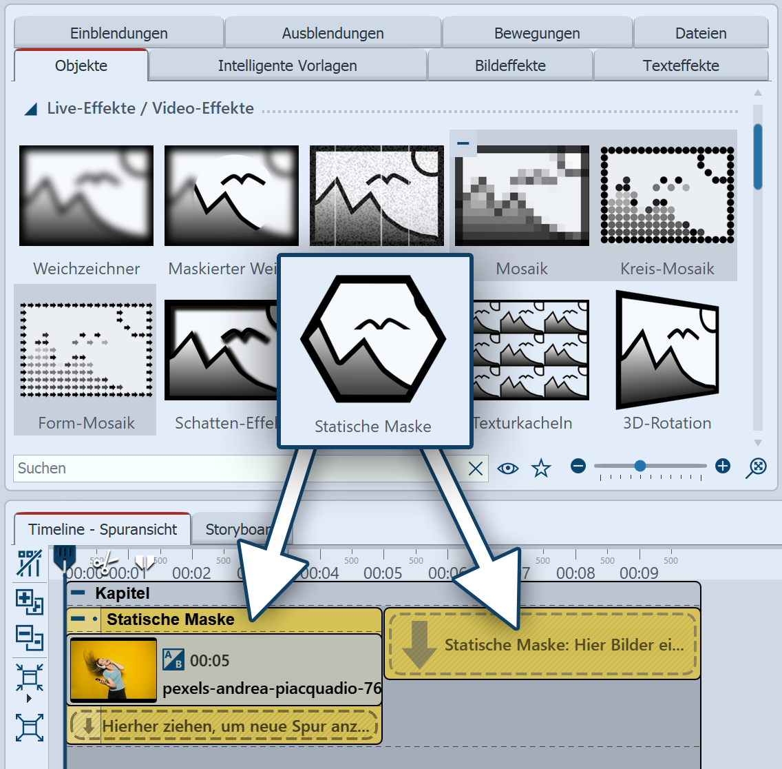Sie finden den Effekt Statische Maske in der Toolbox unter dem Reiter Objekte im Bereich Live-Effekte / Video-Effekte.