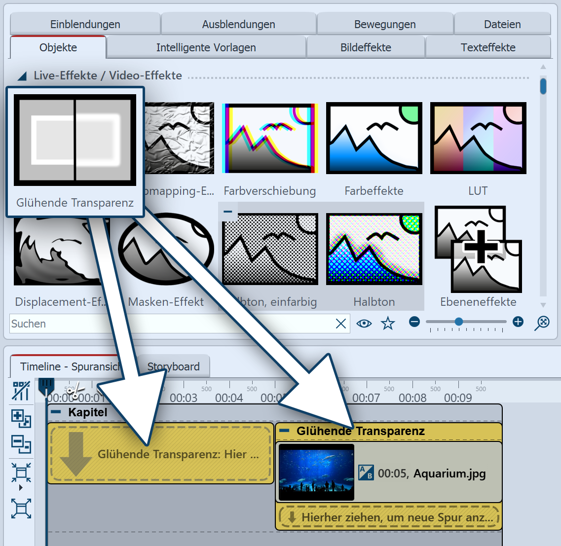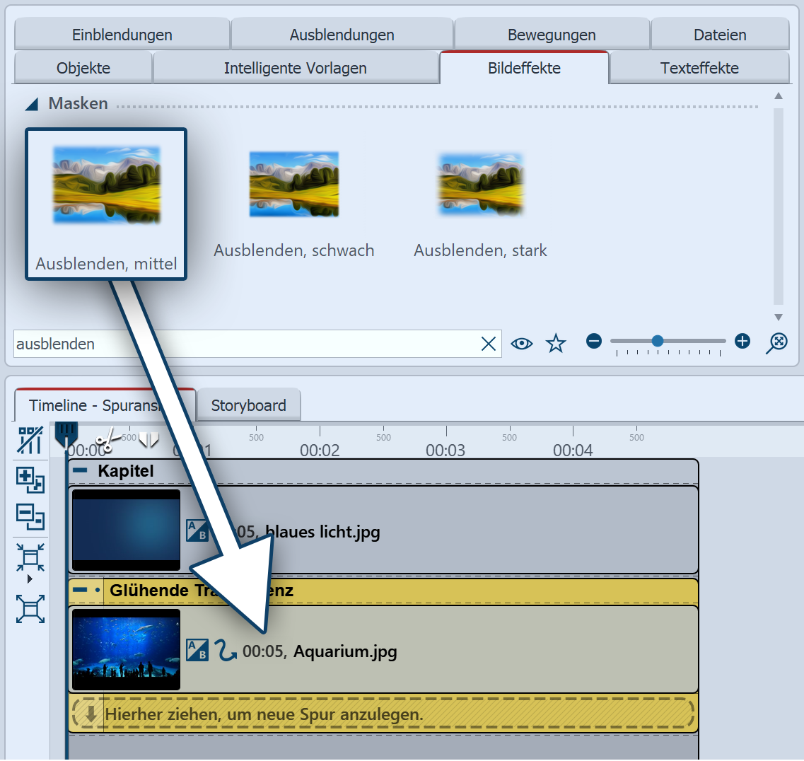 ![]() Glühende Transparenz mit Maske Fügen Sie ein Kapitel-Objekt in die Timeline ein. Ziehen Sie in das Kapitel-Objekt einen Hintergrund Ihrer Wahl. Ziehen Sie in die zweite Spur die Glühende Transparenz und fügen Sie dann ein Bild ein. Verkleinern Sie das Bild etwas im Layoutdesigner. Nun öffnen Sie in der Toolbox den Reiter Bildeffekte. Im Bereich Masken finden Sie den Effekt Ausblenden, mittel. Verwenden Sie ruhig die Suchfunktion am unteren Rand der Toolbox. Ziehen Sie den Bildeffekt auf das Bild in der Timeline. Klicken Sie auf den farbigen Rahmen des Live-Effektes, um die Einstellungen zu verändern. Stellen Sie die Stärke und die Größe so ein, dass der Effekt Ihnen gefällt |