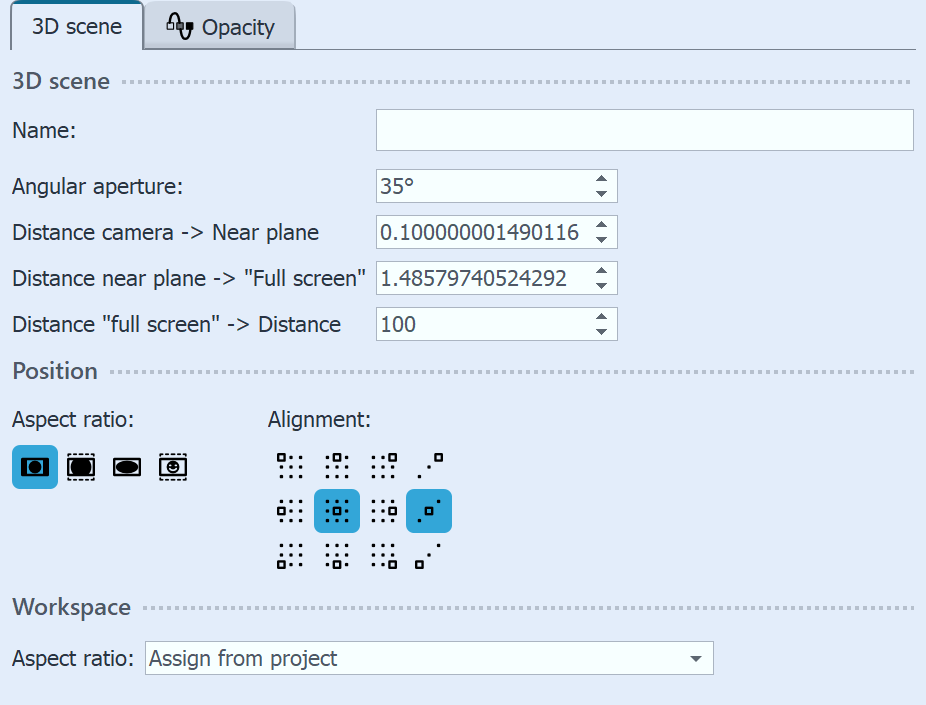 The workspace for the 3D scene is determined by the project aspect ratio X:Y:Z. The value for Z is derived from the shorter side of the aspect ratio. However, the 3D scene can also have its own aspect ratio. To do this, select the setting Own for Aspect ratio. With the setting Automatic, the aspect ratio of the parent element (of another 3D scene or a Flexi collage) is adopted.