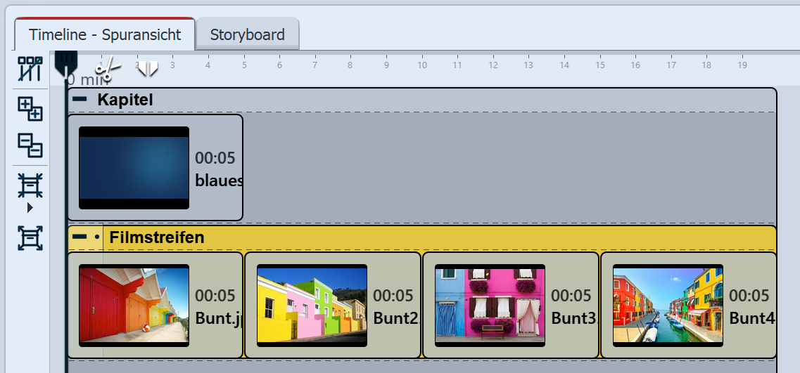 Ziehen Sie zuerst ein Kapitel-Objekt aus der Toolbox in die Timeline. Ziehen Sie in das Kapitel-Objekt ein Hintergrundbild Ihrer Wahl, z.B. aus dem Bereich Hintergründe in der Toolbox oder aus Ihren eigenen Bildern. Ziehen Sie nun den Filmstreifen-Effekt unter das Hintergrundbild auf den Schriftzug "Hierher ziehen, um neue Spur anzulegen".