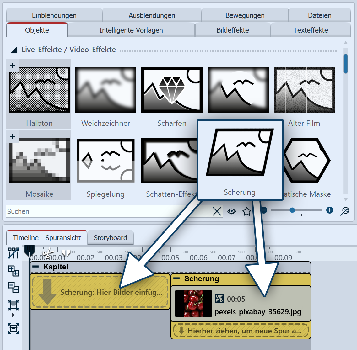 Um ein Bild in den Effekt einzufügen, ziehen Sie dieses aus dem Dateibrowser der Toolbox in das Scherung-Objekt.