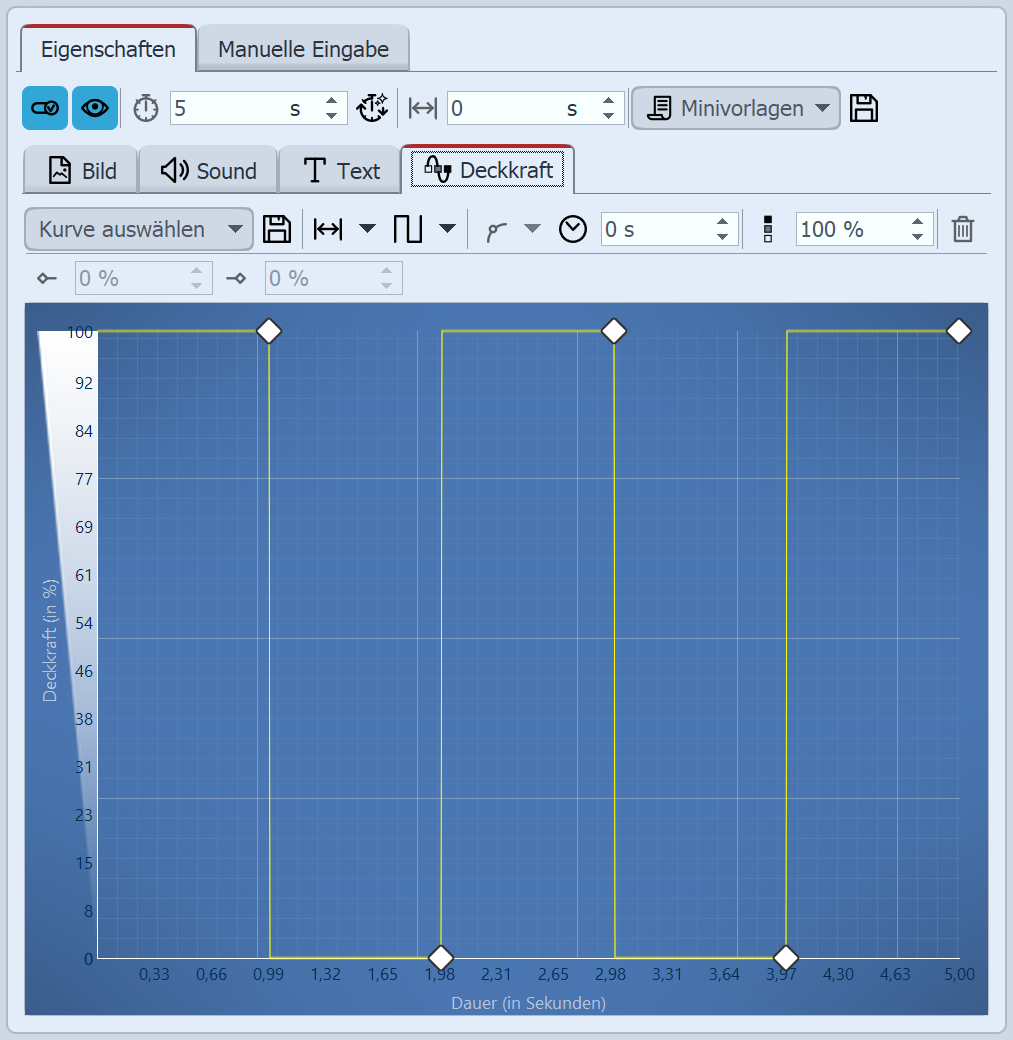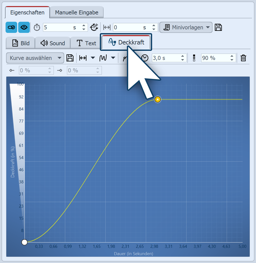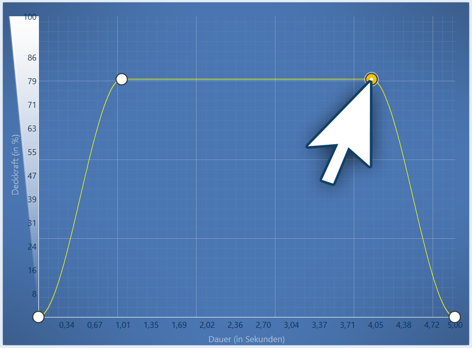 ![]() Die Deckkraft verändert sich über die Zeit Um eine Transparenzkurve für Ihr Objekt erstellen zu können, rufen Sie im Fenster Eigenschaften den Reiter Deckkraft auf. Es erscheint ein Diagramm mit einem blauen Hintergrund, dessen y-Achse für die Deckkraft in Prozent steht, während die x-Achse die Dauer in Sekunden wiedergibt. Setzen Sie mit einem Mausklick Punkte auf der Fläche zwischen den Achsen. Je tiefer der Punkt liegt, desto größer wird die Transparenz des Objektes sein. Befindet sich der Punkt auf der Höhe von 100 % Deckkraft, ist das Objekt nicht transparent, sondern vollständig sichtbar. Unter Kurve auswählen können Sie aus Standardkurven wählen. Wenn Sie eigene Kurvenvorlagen gespeichert haben, finden Sie diese im Abschnitt Eigene Kurven. Über die Auswahl Kurve entfernen, werden alle Marken entfernt.