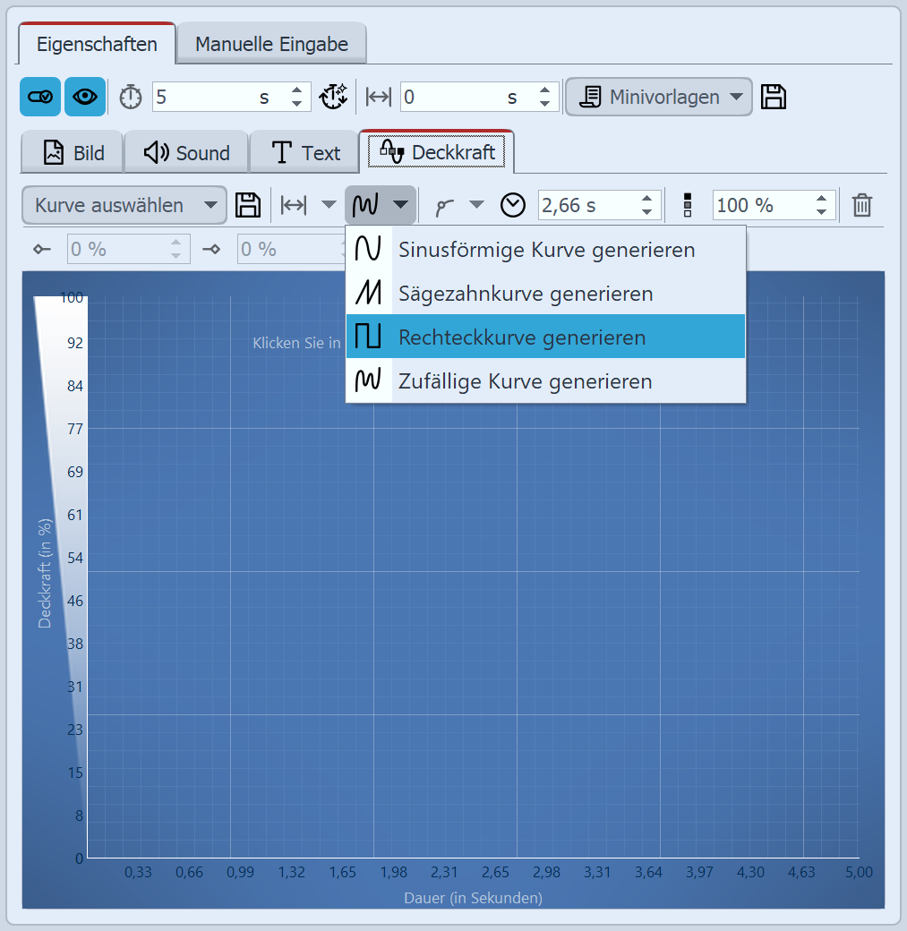 4. Objekt blinken lassen mit generierter Kurve![]() Rechteck-Kurve generieren Um ein Objekt blinken zu lassen, lässt man die Deckkraft intervallmäßig wechseln - zwischen 0 % Deckkraft und 100 % Deckkraft. 1. Klicken Sie auf das Symbol für Kurve generieren und wählen Sie Rechteckkurve generieren. |