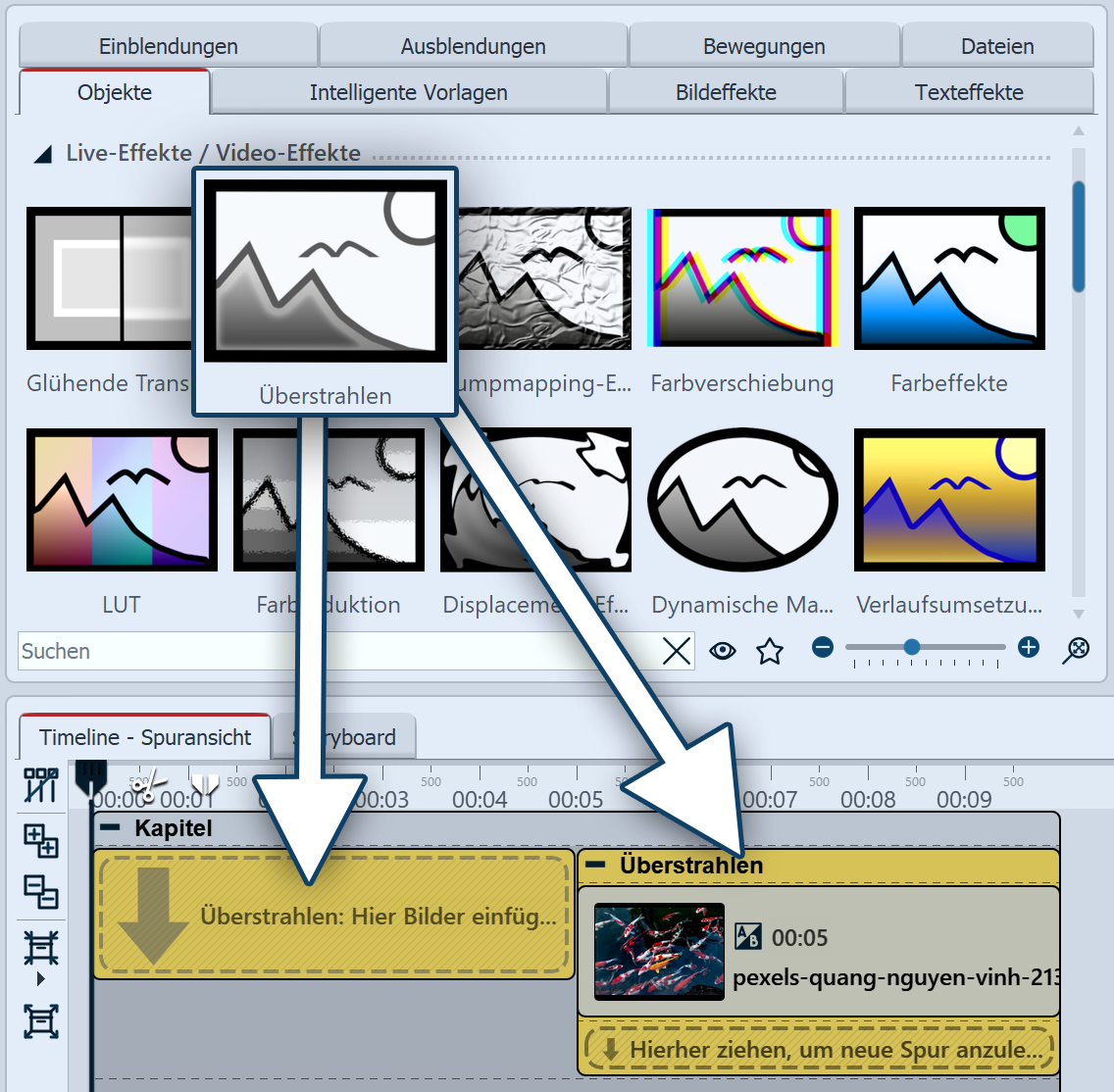 ![]() Überstrahlen Mit dem Effekt Überstrahlen betonen Sie in Fotos oder Videos je nach Einstellung helle Bildbereiche (Licht) oder dunkle Bildbereiche (Schatten) oder beides. Sie finden den Effekt in der Toolbox unter dem Reiter Objekte im Bereich Live-Effekte. |