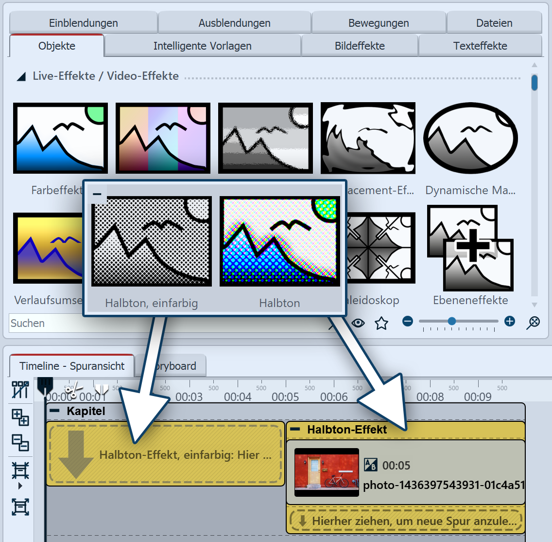 4. Öffnen Sie in der Toolbox den Tab Objekte und ziehen Sie den Effekt Halbton, einfarbig auf das Bild in der unteren Spur.