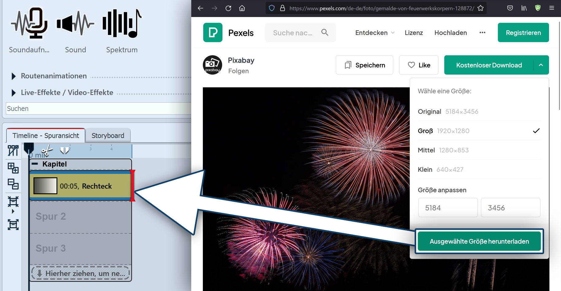 Um Inhalte aus dem Internet, wie Bilder und Videos von Stockanbietern oder Sounds aus Audio-Mediatheken schnell in Ihre Timeline zu übertragen, stehen Ihnen in AquaSoft Vision und Stages mehrere Wege offen.