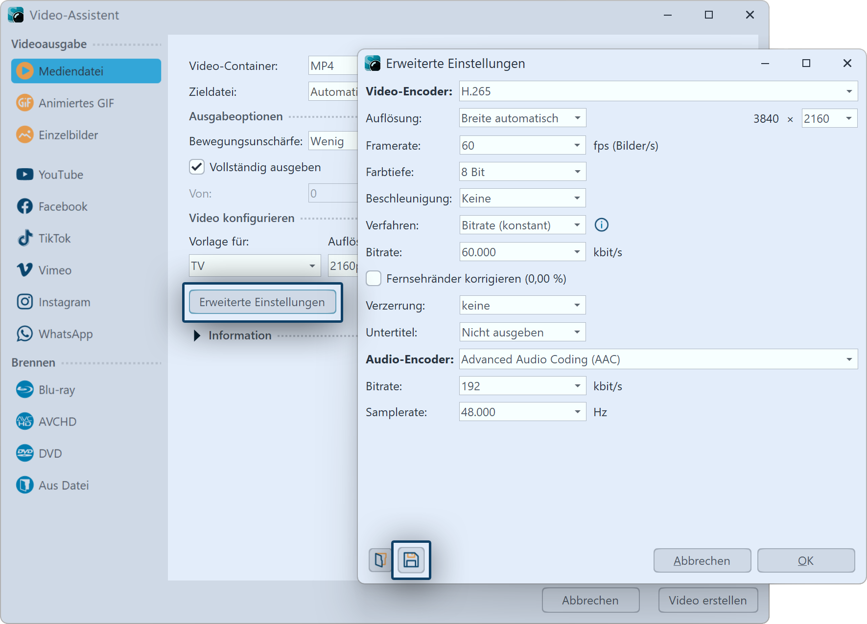![]() Export-Vorlage speichern STAGES In AquaSoft Stages können Sie Ihre Videos per Kommandozeilen-Aufruf generieren lassen. Erstellt werden diese mit Vorgaben, die Sie vorher als Export-Vorlage gespeichert haben. Vorlage speichern Speichern Sie diese Vorlage nun, indem Sie auf das Diskettensymbol klicken und einen Namen vergeben. ![]() Die Vorlage wird als vwp-Datei angelegt. Über Ordner öffnen können Sie sich den Speicherort Ihrer vwp-Datei anzeigen lassen. |