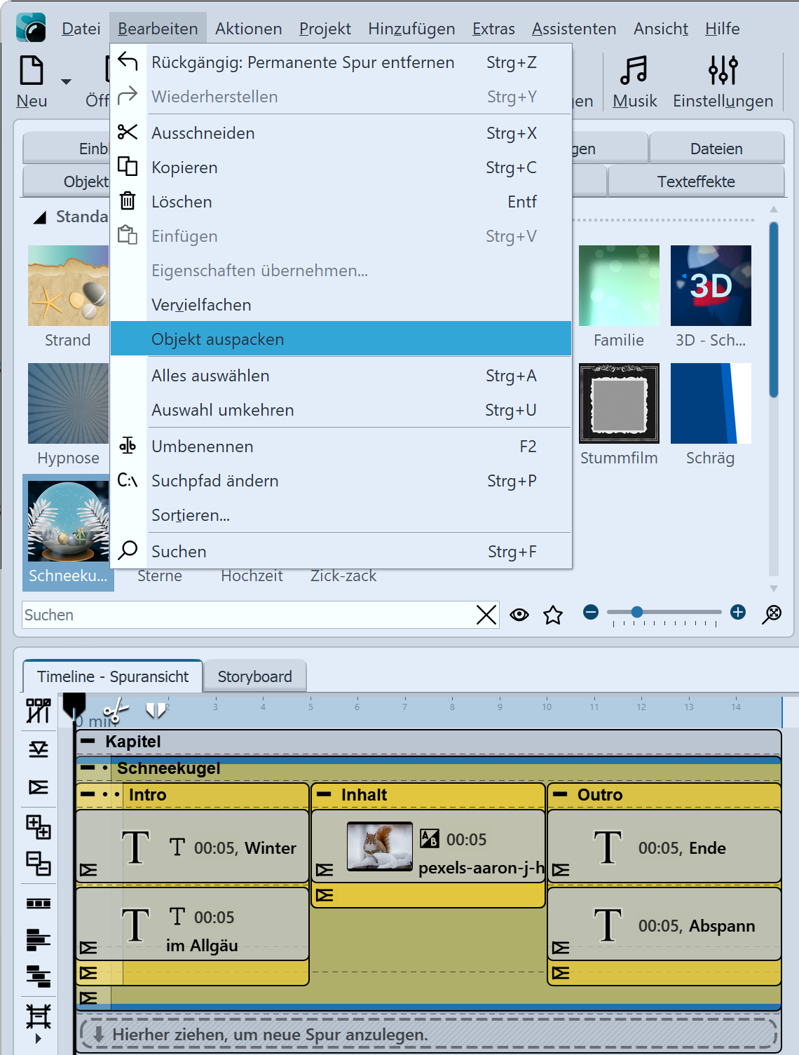 In AquaSoft Stages können Sie Intelligente Vorlagen oder auch Effekte in ihre Bestandteile zerlegen und so die Funktionsweise analysieren oder verändern. Sie sollten eine Intelligente Vorlage bzw. deren Ergebnis nur dann bearbeiten, wenn Sie mit dem Prinzip der Spuren bereits gut vertraut sind. Sie müssen sich gut zurechtfinden können und wissen, welches Objekt für welchen Effekt verantwortlich ist und wie man dessen Einstellungen beeinflussen kann.