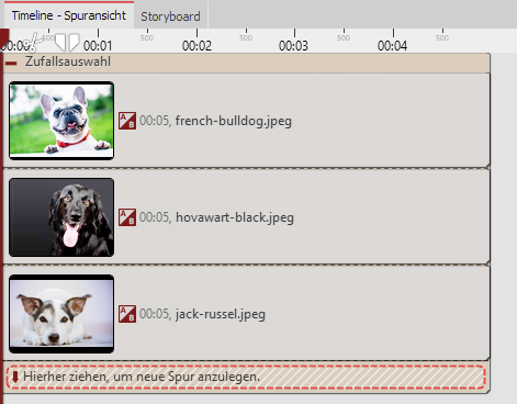 ![]() Einstellungen für Zufallsauswahl 2. Einstellungen für ZufallsauswahlNachdem Sie die Bilder oder Videos eingefügt haben, klicken Sie auf den farbigen Rahmen der Zufallsauswahl in der Timeline.Im Bereich Eigenschaften können Sie jetzt die nebenstehenden Eigenschaften sehen.Steht im Feld Zufallswert der Wert Automatisch, wird bei jedem Abspielen neu entschieden, welche Spur gezeigt wird.