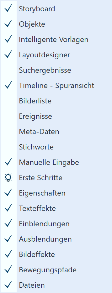 ![]() Steuerelemente Unter Ansicht / Steuerelemente können Sie weitere Steuerelemente, so z.B. die Metadaten, aktivieren, die in der Programmoberfläche oder auf einem zweiten Bildschirm (falls vorhanden) angezeigt werden können. Setzen Sie ein Häkchen vor das Steuerelement, um es zu aktivieren. Damit das Steuerelement nicht mehr angezeigt wird, können Sie es entweder schließen oder das Häkchen im Menü Ansicht / Steuerelemente entfernen. Wenn unter Extras der Entwicklermodus aktiv ist, stehen weitere Steuerelemente zur Auswahl.