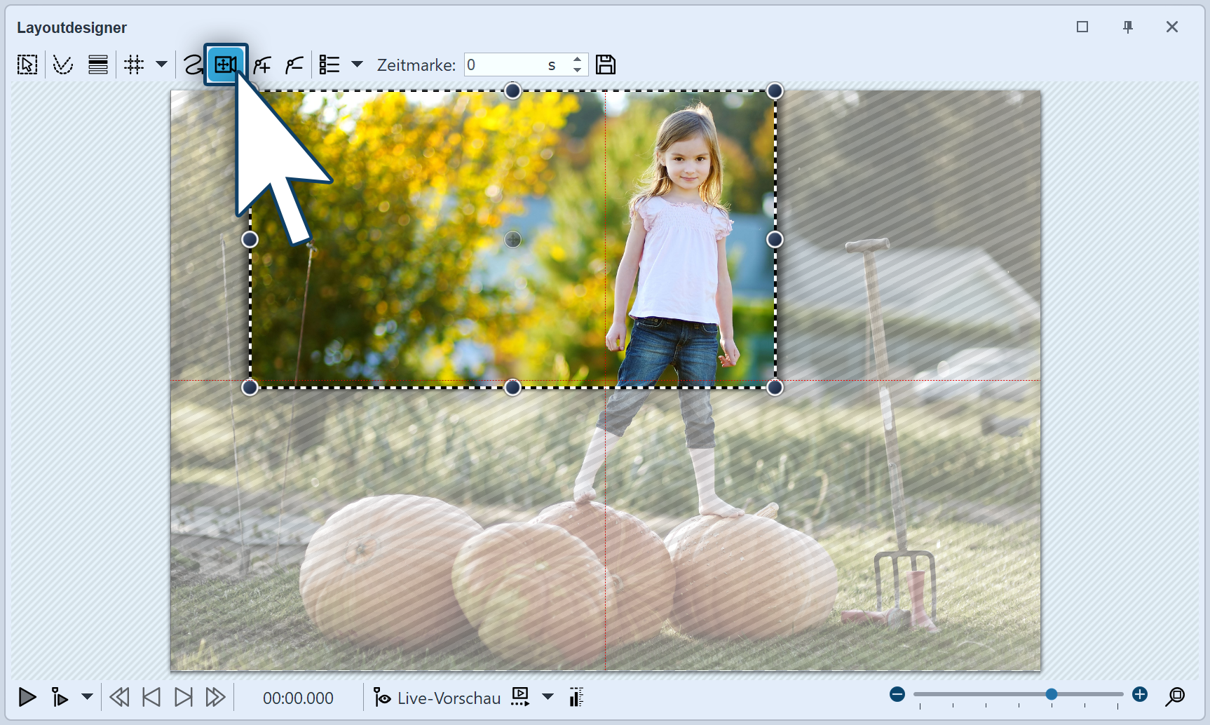 ![]() Zoom & Kameraschwenk aktivieren Klicken Sie das Bild-Objekt in der Bilderliste oder Timeline an, damit das Bild im Layoutdesigner angezeigt wird. Sollte das Bild im Layoutdesigner schwarze Ränder zeigen, können Sie in den Eigenschaften das Bild beim Seitenverhältnis auf Zuschneiden stellen. Nun aktivieren Sie das Zoom & Kameraschwenk-Werkzeug, indem Sie auf das entsprechende Symbol an der oberen Leiste im Layoutdesigner klicken. Ist das Zoom & Kameraschwenk-Werkzeug aktiv, erscheint für kurze Zeit der Schriftzug "Kameraschwenk" über dem Bild im Layoutdesigner. Gleich nachdem Sie den Zoom & Kameraschwenk aktiviert haben, erscheint um das Vorschaubild ein gestrichelter Rahmen - der Positionsrahmen. Verkleinern Sie diesen Positionsrahmen und legen Sie so den Bildausschnitt fest, der zuerst zu sehen sein soll. |