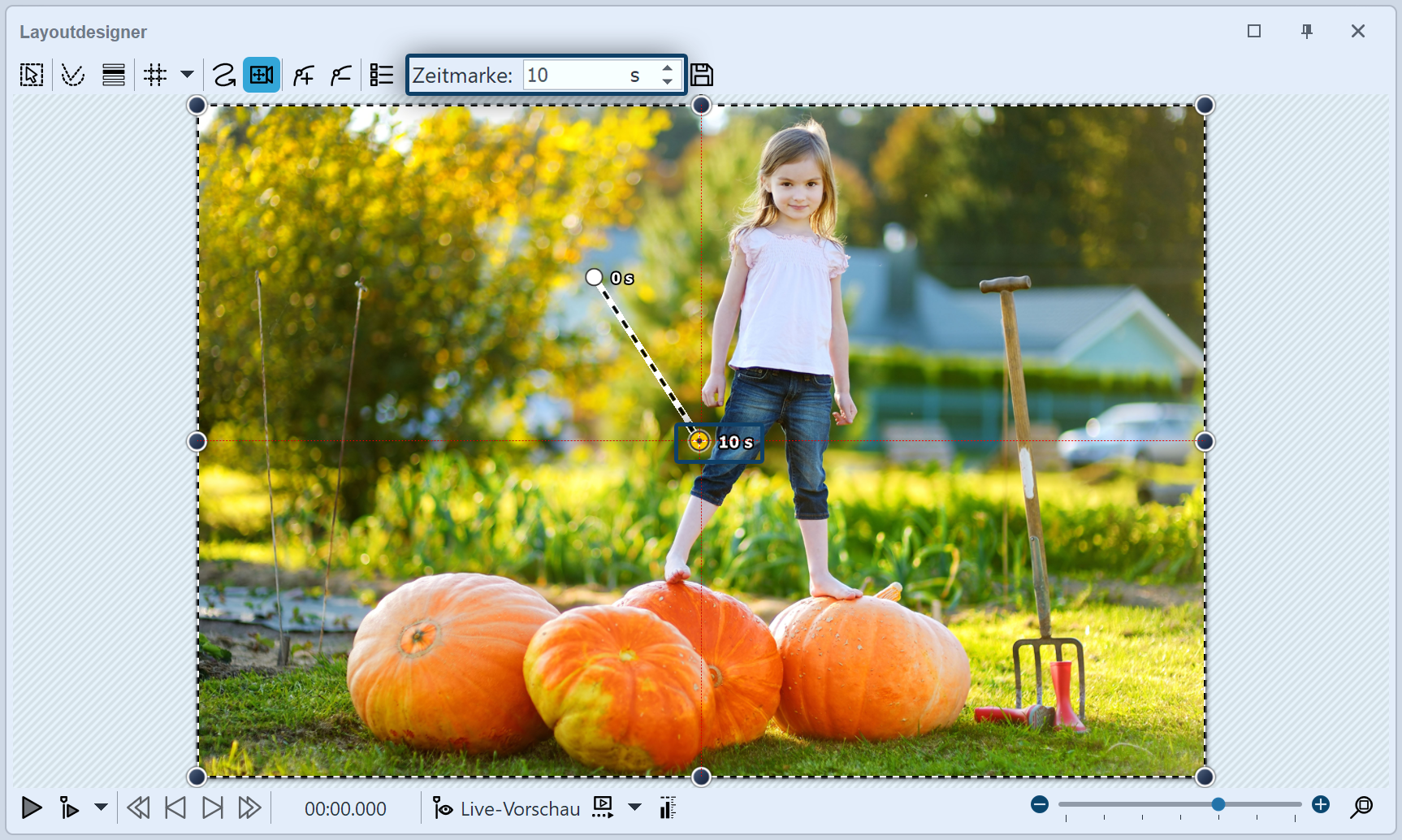 ![]() Zeit verlängern Damit die Kamera von einem Ausschnitt zum nächsten nicht zu abrupt schwenkt, verlängern Sie die Zeit, die für den Kameraschwenk zur Verfügung steht. Dazu wählen Sie im Layoutdesigner oder via Manueller Eingabe die erste Marke aus, sodass diese farbig angezeigt wird. Unter Zeitmarke geben Sie nun einen höheren Wert ein, z.B. 10 Sekunden. |