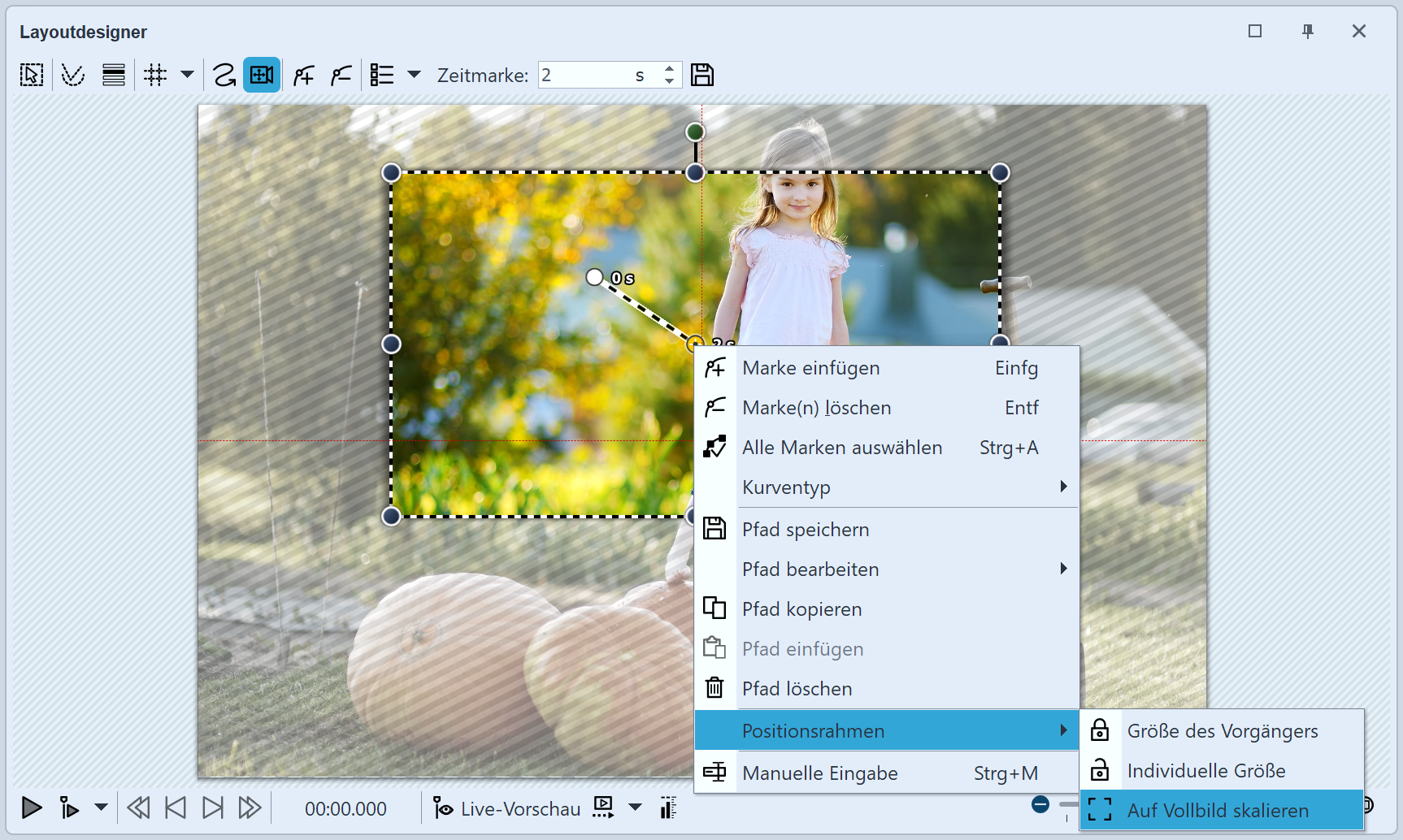 ![]() Bewegungsmarke einfügen Damit aus dem eben gewählten Ausschnitt herausgezoomt werden kann, müssen Sie nun eine neue Bewegungsmarke erstellen. Klicken Sie dazu auf das Plus-Symbol zum Einfügen einer Bewegungsmarke oder benutzen Sie die Taste Einfg . Es erscheint eine weitere Marke mit neuem Positionsrahmen. Klicken Sie mit der rechten Maustaste in den Rahmen und rufen Sie damit das Kontextmenü auf. |
