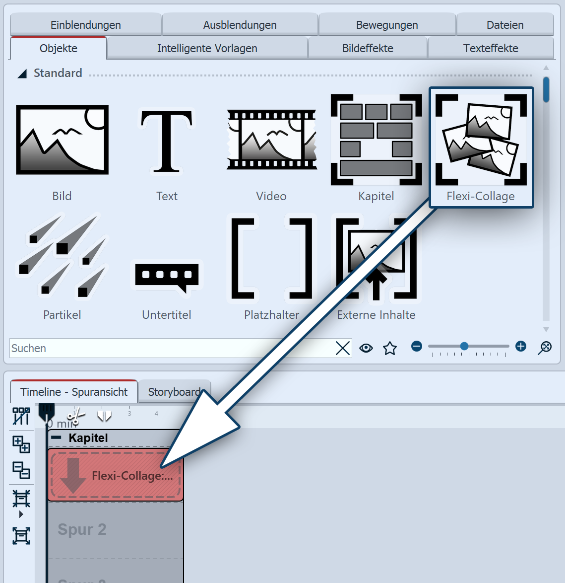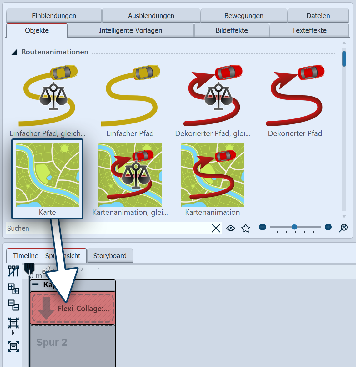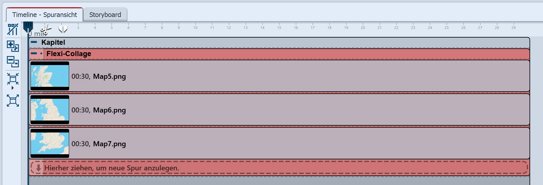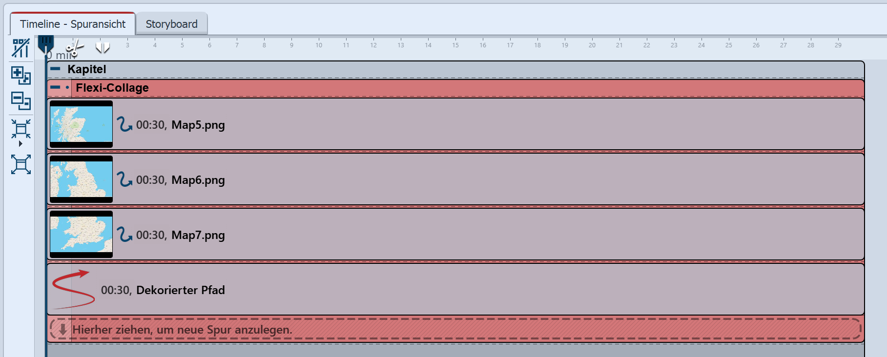 ![]() Flexi-Collage einfügen 1. Flexi-Collage einfügen Es sollen mehrere Kartenteile eingefügt werden, die zu einer Collage miteinander verbunden werden. Damit die Kartenteile später als ein ganzes Objekt behandelt werden können, werden sie in einer Flexi-Collage gruppiert. Die Flexi-Collage ziehen Sie im ersten Schritt aus der Toolbox in die Timeline. |