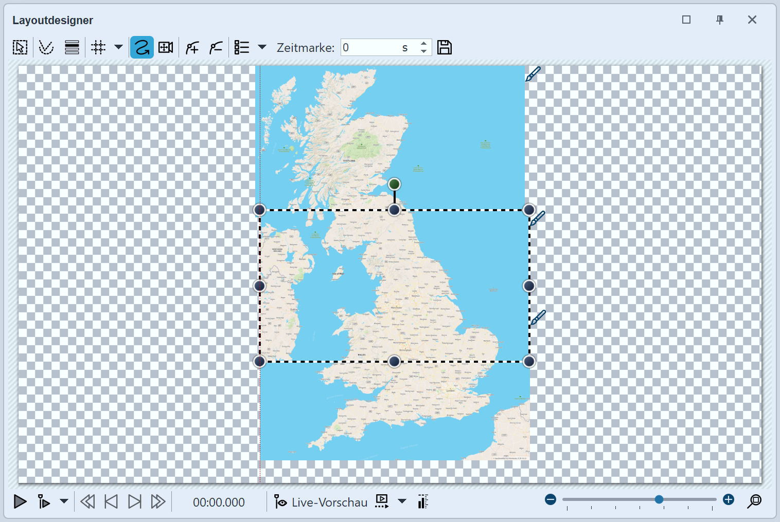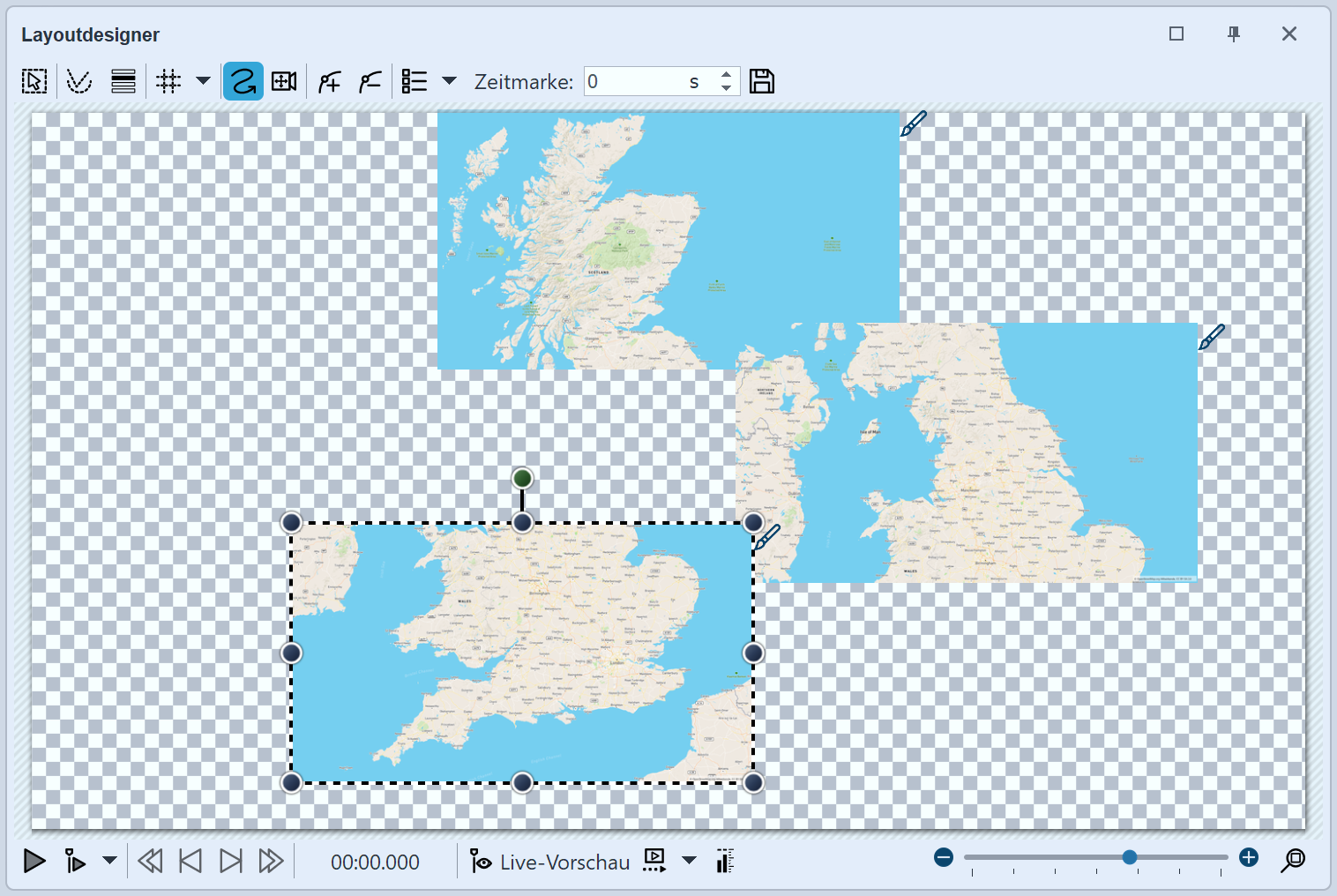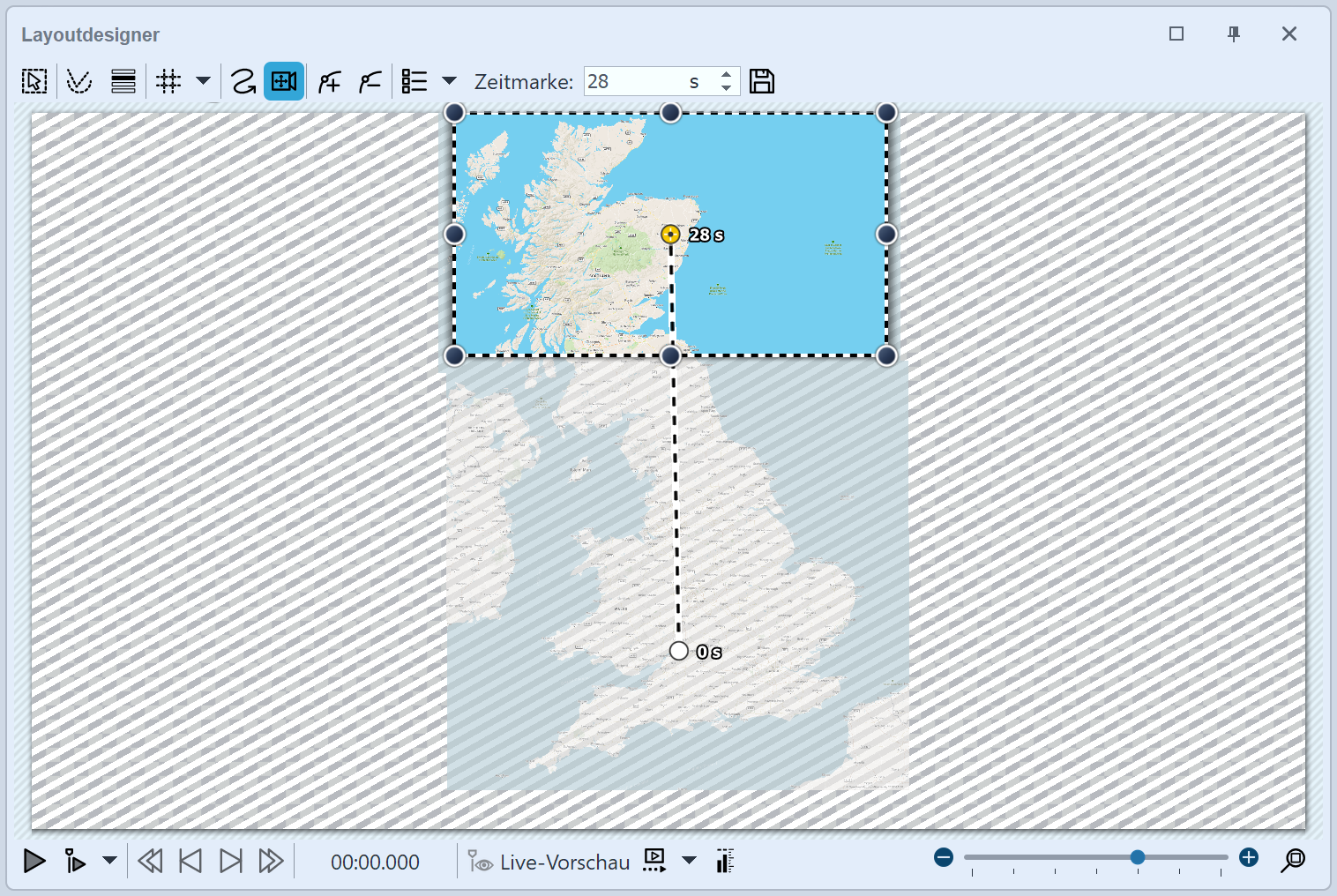 Unter Datei / Öffnen / Beispiel-Projekt finden Sie eine Animation mit dem Titel "Fahrt über Karte". Darin befindet sich eine aus mehreren Ausschnitten zusammengefügte Karte. Auf dieser bewegt sich ein Pfad, an dem nach und nach einige Bilder auftauchen. |