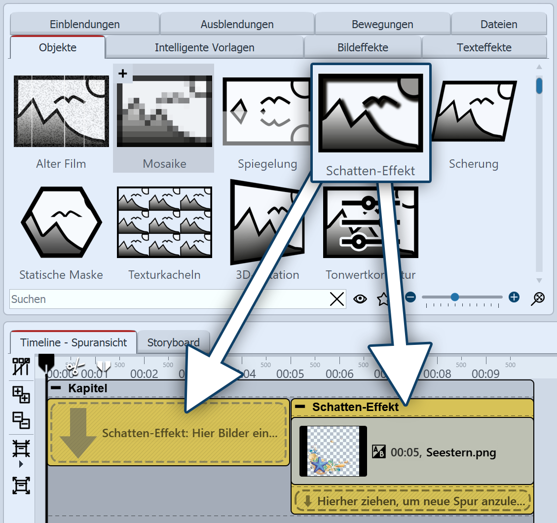 5.Ziehen Sie in den leeren Schatten-Effekt ein Text-Objekt und eine freigestellte Grafik mit einem transparenten Hintergrund. Die Objekte müssen sich in der Timeline untereinander befinden, damit sie gleichzeitig angezeigt werden.