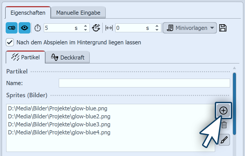 Weitere Grafiken hinzufügen Nachdem Sie alle Schritte aus dem Kapitel "Einfacher Partikel-Effekt" vollzogen haben, gehen Sie in die Einstellungen für das Partikel-Objekt. Dort können Sie im oberen Bereich über das Plus-Symbol weitere Bilder hinzufügen. Die Einzelbilder sollten gut aufeinander abgestimmt sein. |