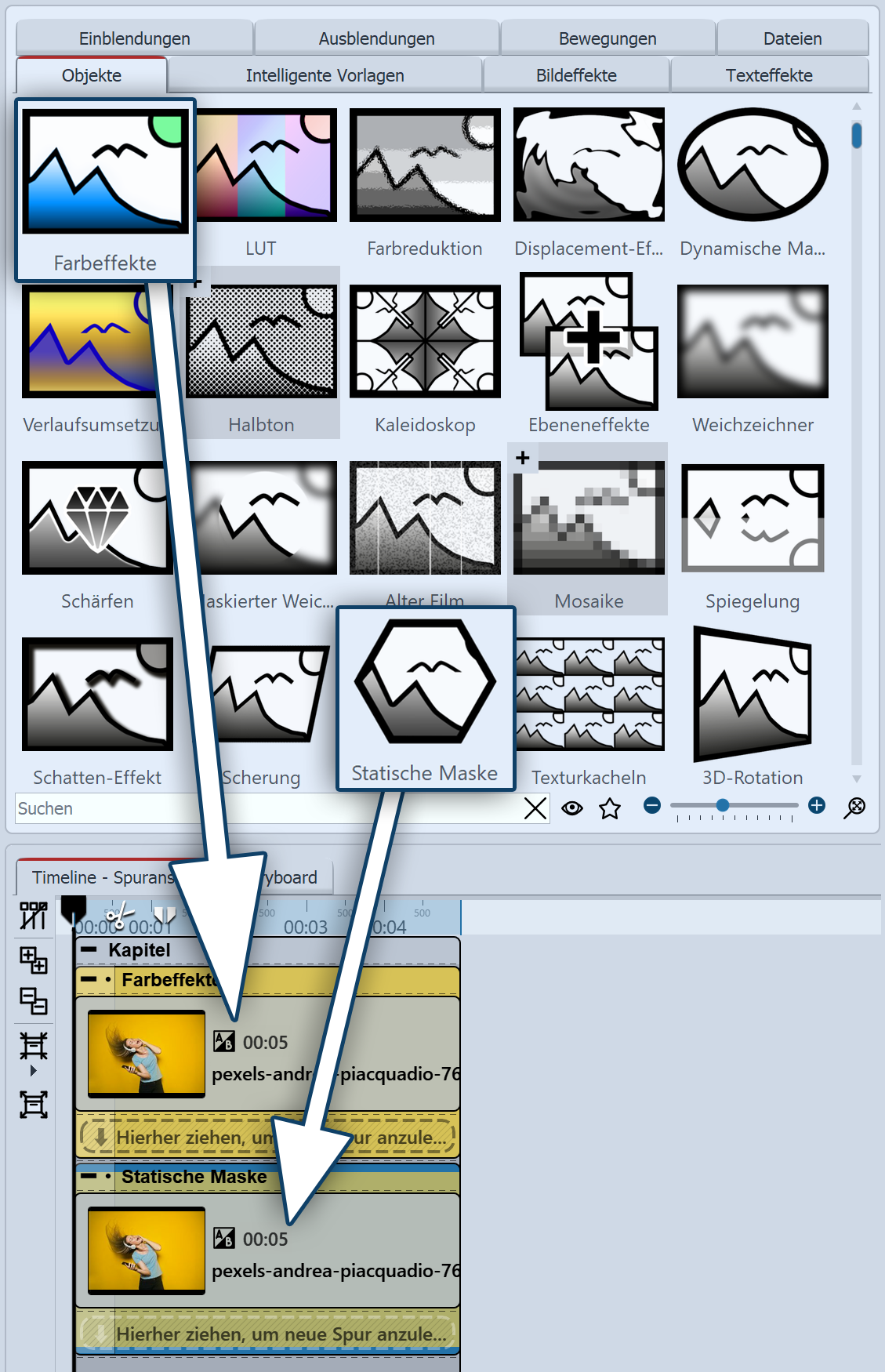 Sie können den Effekt auch direkt in die Timeline ziehen und dann per Drag-and-Drop bzw. mit Hilfe des Bild-Objektes oder des Video-Objektes befüllen.