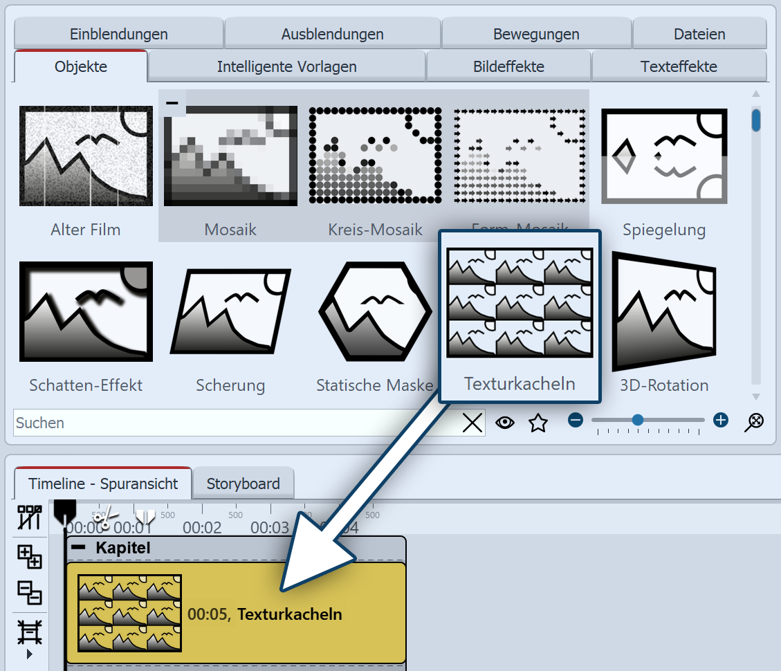 ![]() Texturkacheln einfügen Ziehen Sie den Effekt aus der Toolbox an die gewünschte Stelle in der Timeline. Normalerweise wird der Effekt als Hintergrund angewendet. Sie können also zunächst auch ein Kapitel einfügen und dann den Effekt in das Kapitel ziehen. |