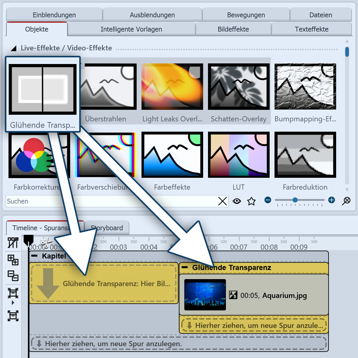 ![]() Glühende Transparenz mit Maske Fügen Sie ein Kapitel-Objekt in die Timeline ein. Ziehen Sie in das Kapitel-Objekt einen Hintergrund Ihrer Wahl. Ziehen Sie in die zweite Spur die Glühende Transparenz und fügen Sie dann ein Bild ein. Verkleinern Sie das Bild etwas im Layoutdesigner. Nun öffnen Sie in der Toolbox den Reiter Bildeffekte. Im Bereich Masken finden Sie den Effekt Ausblenden, mittel. Verwenden Sie ruhig die Suchfunktion am unteren Rand der Toolbox. Ziehen Sie den Bildeffekt auf das Bild in der Timeline. Klicken Sie auf den farbigen Rahmen des Live-Effektes, um die Einstellungen zu verändern. Stellen Sie die Stärke und die Größe so ein, dass der Effekt Ihnen gefällt |