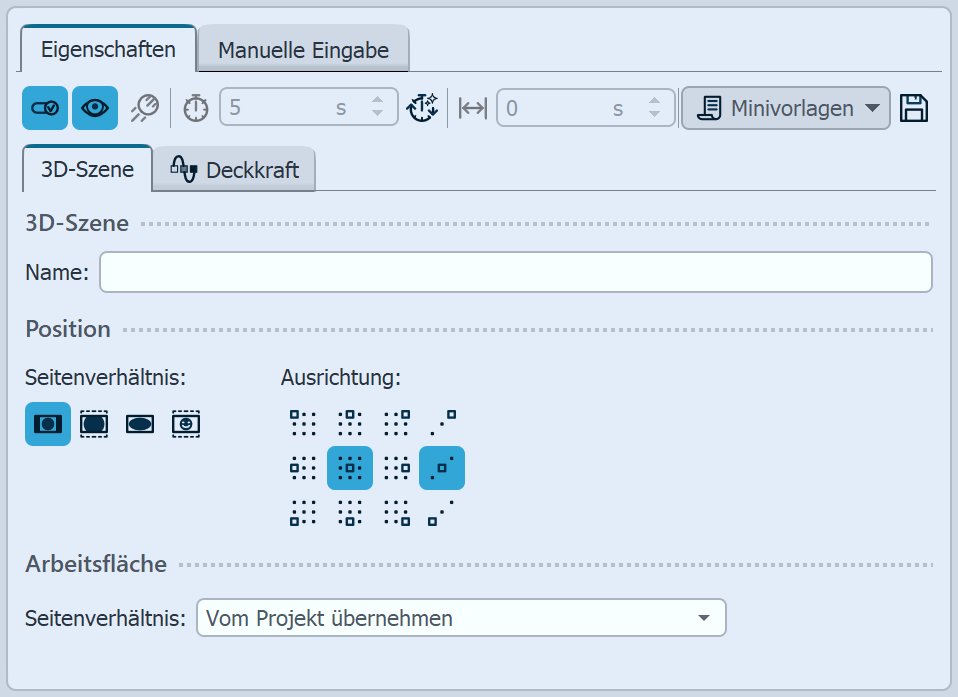 ![]() Eigenschaften 3D-Szene 2. Einstellungen des 3D-Szene-ObjektesMarkieren Sie das 3D-Szene-Objekt in der Timeline, um deren Eigenschaften zu sehen. Die Arbeitsfläche für die 3D-Szene ergibt sich aus dem Projektseitenverhältnis X:Y:Z. Der Wert für Z ergibt sich dabei aus der kürzeren Seite des Seitenverhältnisses. Die 3D-Szene kann jedoch auch ein eigenes Seitenverhältnis erhalten. Wählen Sie dafür bei Seitenverhältnis die Einstellung Eigenes. Mit der Einstellung Automatisch wird das Seitenverhältnis des Elternelementes (einer weiteren 3D-Szene oder einer Flexi-Collage) übernommen. Die Arbeitsfläche ist im Layoutdesigner, sobald Sie ein Objekt innerhalb der 3D-Szene betrachten, durch eine helle Fläche auf dem Boden visualisiert. |