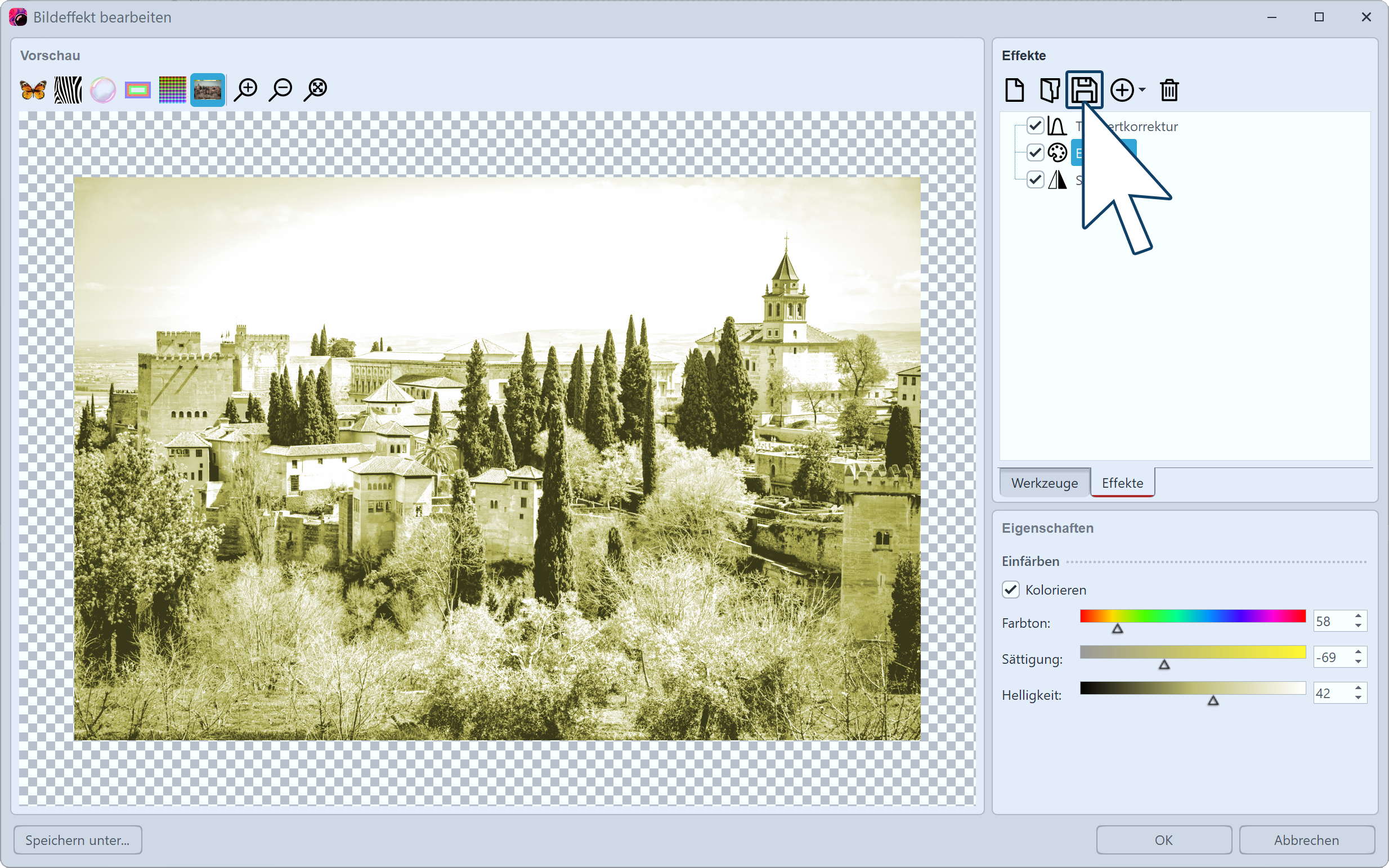In der Toolbox finden Sie den Effekt dann unter Bildeffekte / Eigene Bildeffekte.