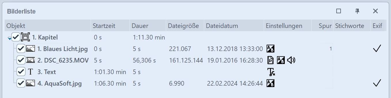 Sie sehen hier die Start- und Standzeiten der Objekte. Bei Bildern werden Ihnen die Dateigröße und der Dateiname angezeigt. Sie können unter Extras / Programmeinstellungen / Bilderliste selbst auswählen, welche Parameter angezeigt werden sollen.