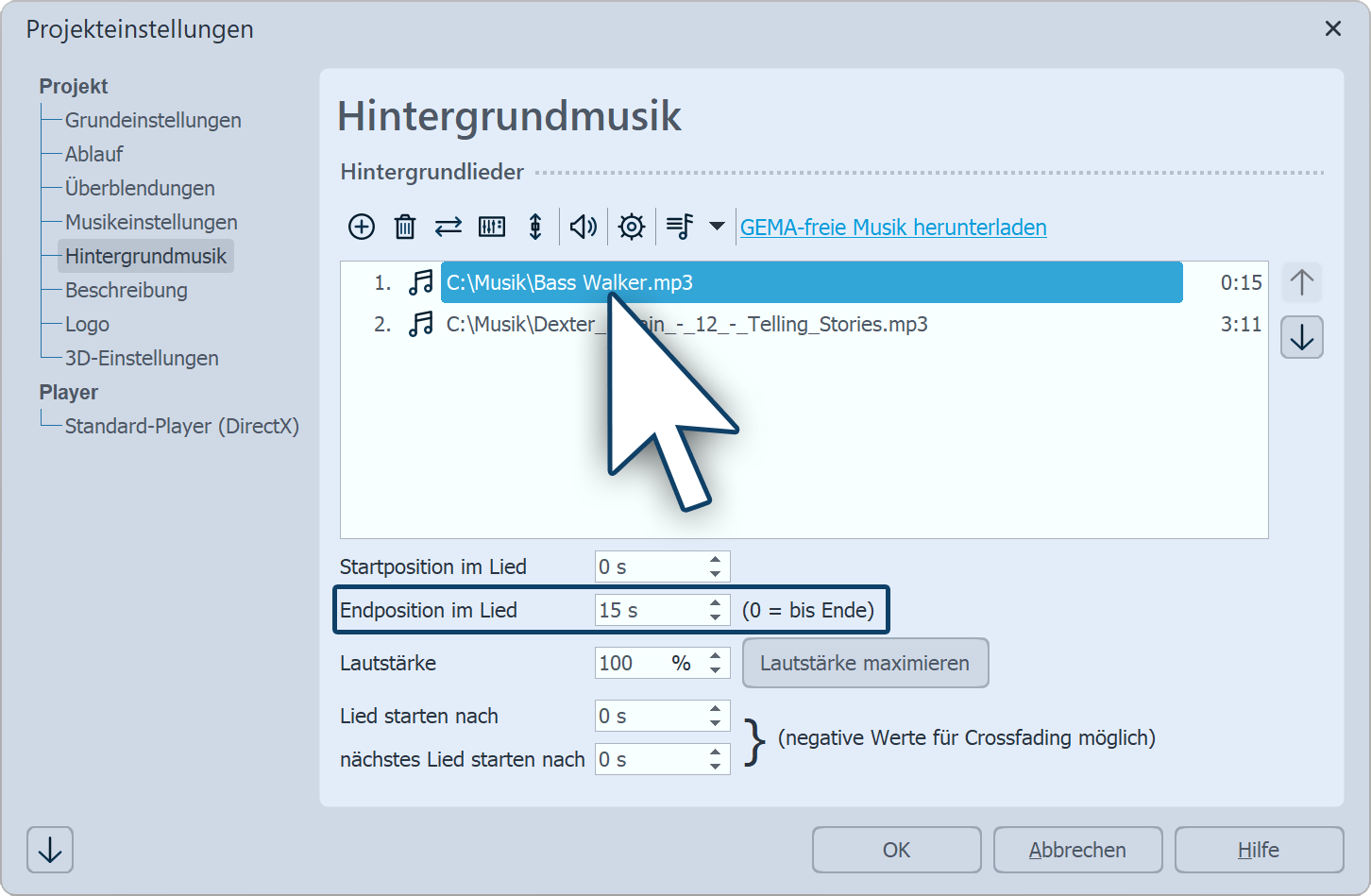 ![]() Endposition des Titels festlegen Klicken Sie auf den Titel und geben Sie unter Endposition die Dauer Ihrer Bildgruppe ein. |