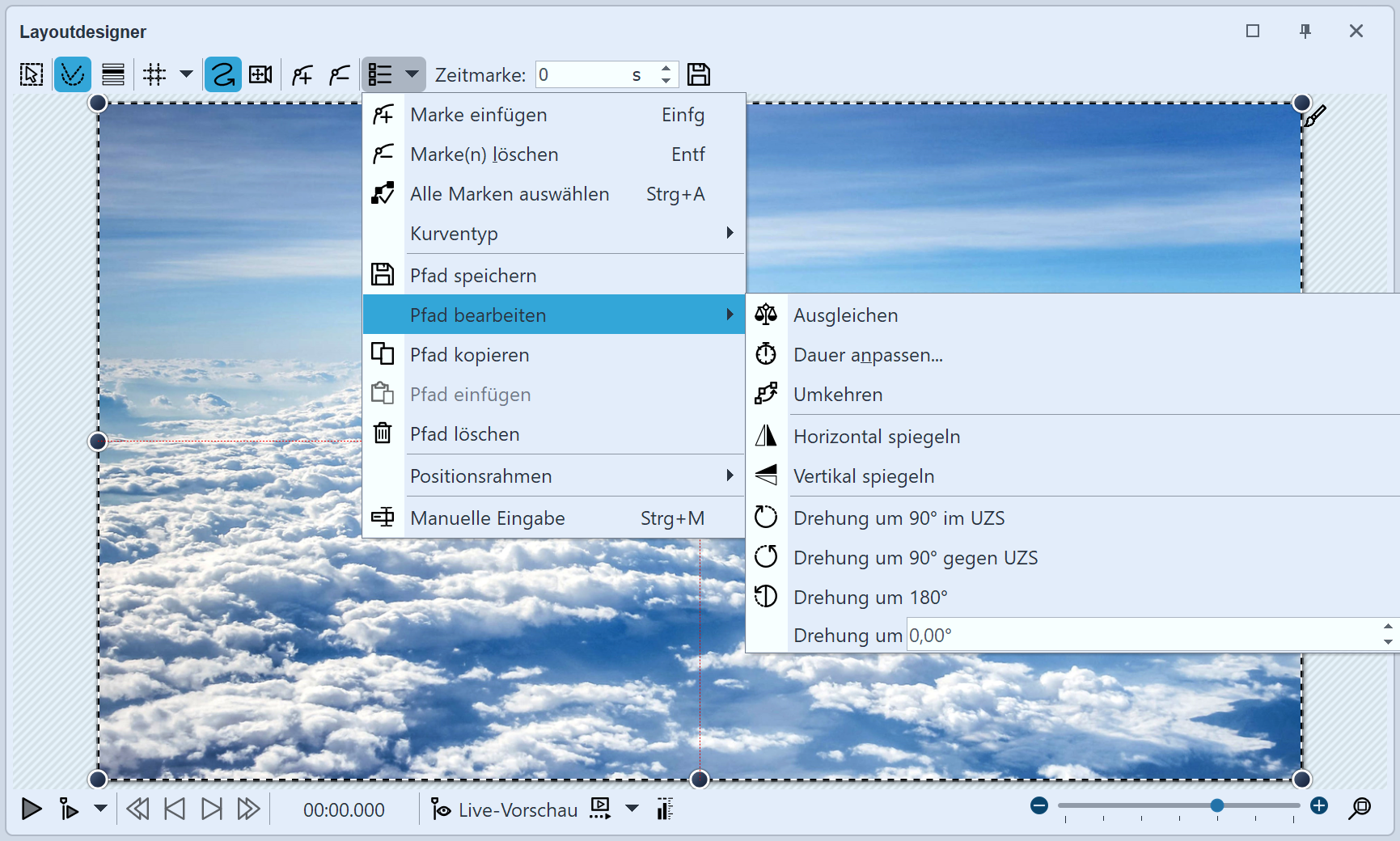 Rufen Sie im Layoutdesigner das Kontextmenü auf, so stehen Ihnen unter dem Punkt Pfad bearbeiten weitere Optionen zur Verfügung. Dazu klicken Sie auf das Symbol im Layoutdesigner oder rufen Sie es per Rechtsklick im Layoutdesigner auf.