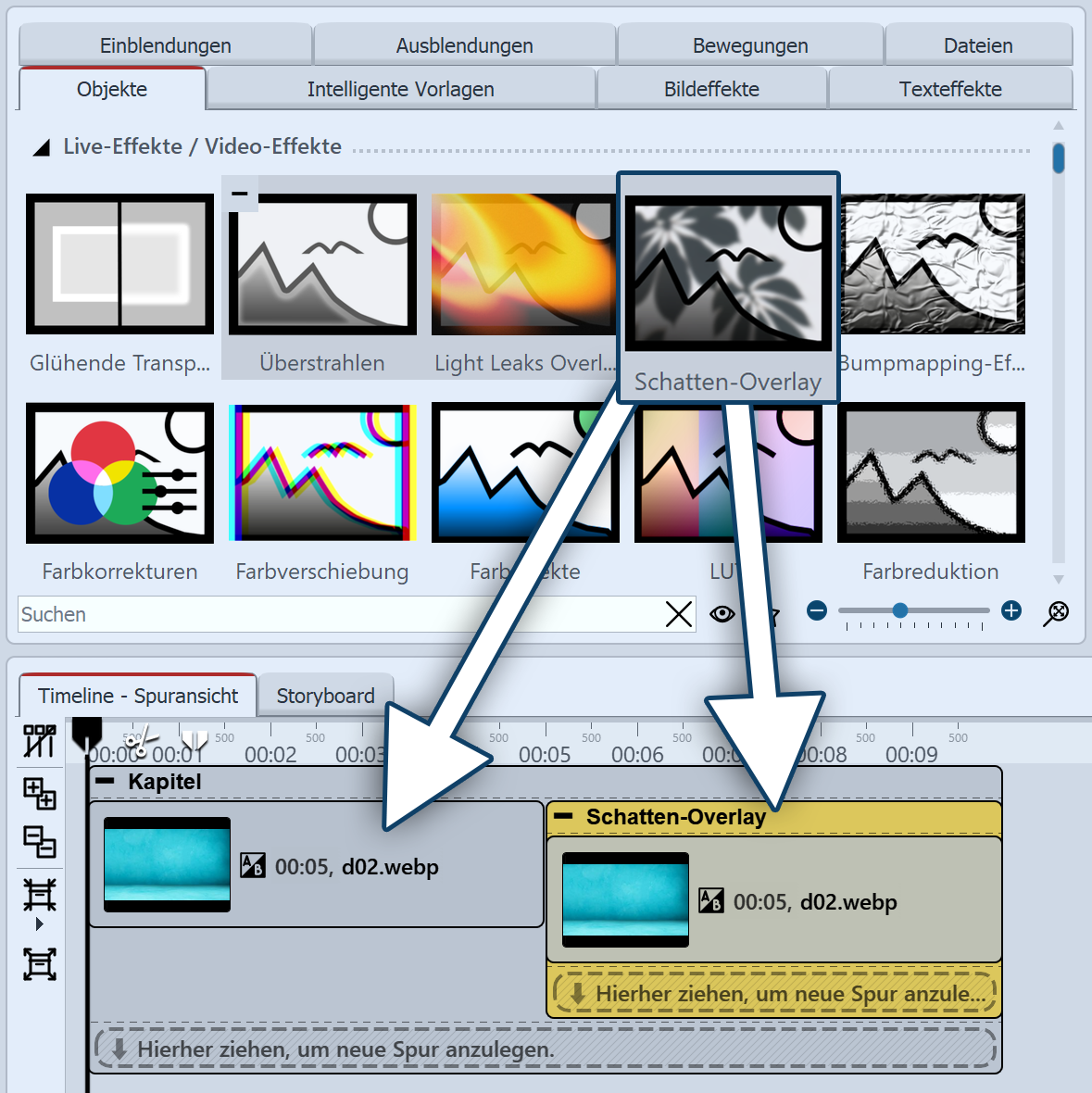 ![]() Schatten-Overlay einfügen Um den Effekt zu verwenden, können Sie ihn direkt auf ein Bild oder Video in der Timeline ziehen. Sie können den Effekt auch in die Timeline ziehen und später eines oder mehrere Bilder oder Videos in den Effekt einfügen. Wenn Sie auf den farbigen Rahmen des Effektes klicken, können Sie im Bereich Eigenschaften die Einstellungen für den Effekt festlegen.