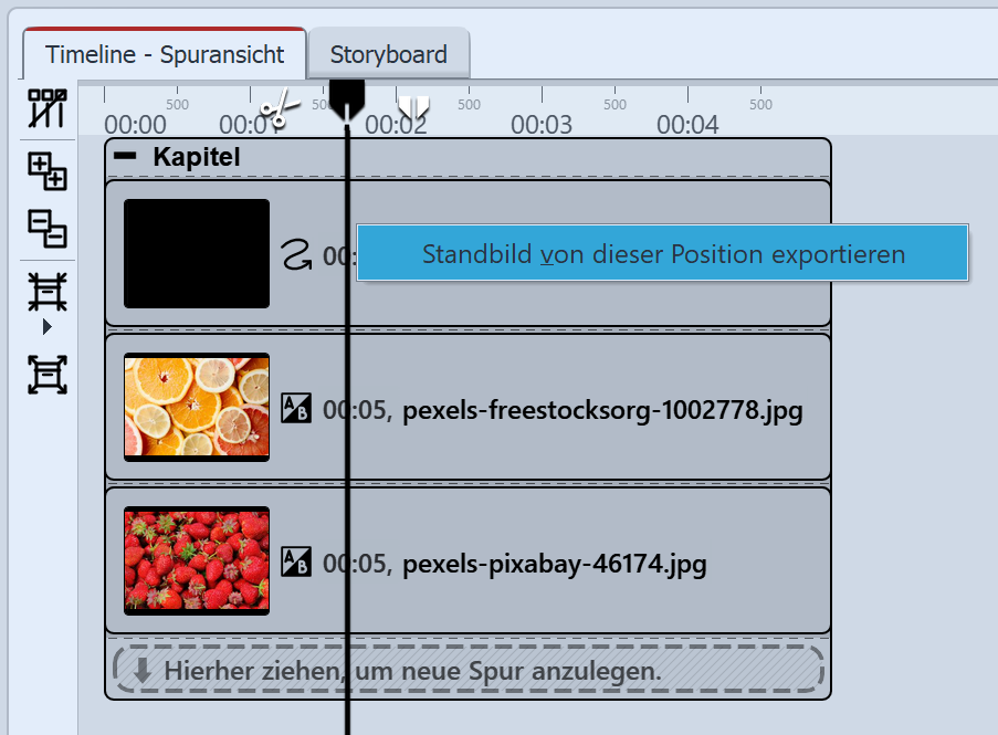 Manchmal besteht der Wunsch, aus einem Projekt ein bestimmtes Standbild herauszulösen, um dieses im Projekt oder auch in externen Programmen weiter zu nutzen. Das kann ein originelles Videoframe, eine schöne Bild-Collage oder auch ein beschriftetes Foto sein. In der Timeline finden Sie dafür die Funktion Standbild von dieser Position exportieren. Erzeugt wird dann eine JPG- oder PNG-Datei.