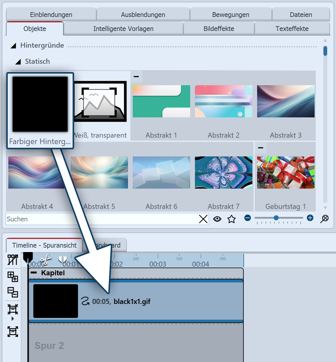 ![]() "Farbiger Hintergrund" aus Toolbox in Timeline ziehen In der Toolbox unter Objekte gibt es im Bereich Hintergründe den Farbigen Hintergrund. Mit diesem können Sie Texte unabhängig von Bildern einblenden. Der Farbige Hintergrund kann dabei auch eine Ein- bzw- Ausblendung erhalten. Ziehen Sie den Farbigen Hintergrund aus der Toolbox in die Timeline und platzieren Sie ihn an der gewünschten Stelle. |