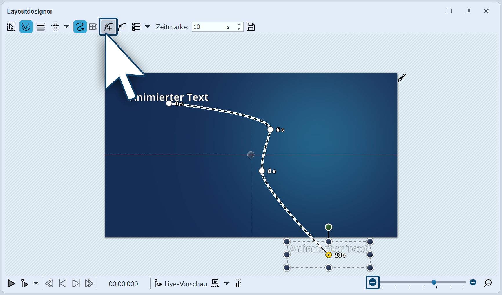 ![]() Text im Layoutdesigner platzieren Klicken Sie das Text-Objekt in der Timeline an. Stellen Sie sicher, dass sich der Layoutdesigner im Bewegungspfad-Modus befindet. Sie sehen das Text-Objekt im Layoutdesigner. Es ist von einem gestrichelten Rahmen und einigen runden Punkten umgeben. Bewegen Sie den Cursor auf den Text und verschieben Sie den Text bei gedrückter Maustaste. So können Sie den Text nach Belieben platzieren. Über dem Vorschaubild im Layoutdesigner befinden sich einige Symbole, mit denen Sie die Animation erstellen können. |
