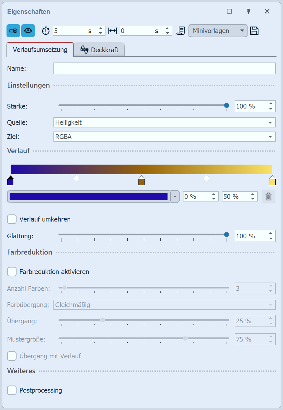 ![]() Einstellungen für Verlaufsumsetzung Im Bereich Einstellungen können Sie nun die Wirkung des Effektes festlegen. Mit der Stärke bestimmen Sie, wie stark Ihr Originalbild vom Effekt überlagert werden soll. Die Verlaufsumsetzung nutzt die Quelle oder Quellfarbe, um sie auf den Verlauf abzubilden. Die Quelle ist standardmäßig die Helligkeit (also die Kombination aller Farben). Stattdessen kann aber auch nur die Intensität eines bestimmten Farbkanals verwendet werden. Beim Ziel wird festgelegt, ob das komplette Bild modifiziert werden soll (RGBA) oder auch nur ein bestimmter Farbkanal. Am Verlauf wählen Sie die Farben, dessen Werte auf Ihr Bild übertragen werden sollen. Um die Farben für den Verlauf anzupassen, klicken Sie zuerst auf das Farbstopp-Symbol links, in der Mitte oder rechts, um auszuwählen, welche Farbe angepasst werden soll. Der ausgewählte Farbstopp ist durch ein schwarzes Dreieck gekennzeichnet. Klicken Sie mit der Maus in das Farbfeld, um die Farbe für den Farbstopp im Farbwähler auszusuchen. Mehr zu den Einstellungen siehe Kapitel Dynamischer Farbverlauf. Die optionale Farbreduktion senkt die Farben des im Effekt eingestellten Farbverlaufs. Je nach gewählter Einstellung für den Farbübergang erhält man bei aktivierter Farbreduktion an den Farbübergängen weiche oder harte Kanten. Im Bereich Minivorlagen finden Sie unterschiedlich voreingestellte Varianten des Effekts. Auf den Thumbnails in der Galerie können Sie sehen, wie die jeweilige Vorlage wirkt. Klicken Sie die gewünschte Vorlage an, um diese auf Ihr Bild oder Video anzuwenden. |