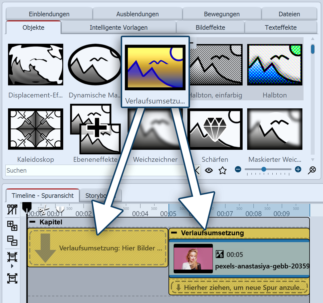 ![]() Verlaufsumsetzung Mit dem Effekt Verlaufsumsetzung wird ein Foto oder Video anhand eines Farbverlaufs, der direkt im Effekt einstellbar ist, eingefärbt. Dunkle Bildbereiche erhalten die Farbe vom Anfang des Verlaufs, helle Bildbereiche die Farbe vom Ende des Verlaufs. Sie finden den Effekt in der Toolbox unter dem Reiter Objekte im Bereich Live-Effekte. |